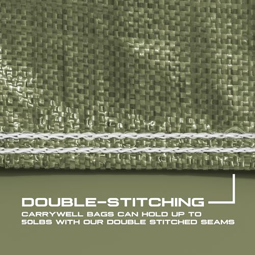 - Toughest Material : Carrywell sandbags are made of 850 denier woven polypropylene with a double stitched bottom seam for extra strength. Tearproof, sturdy and built tough.