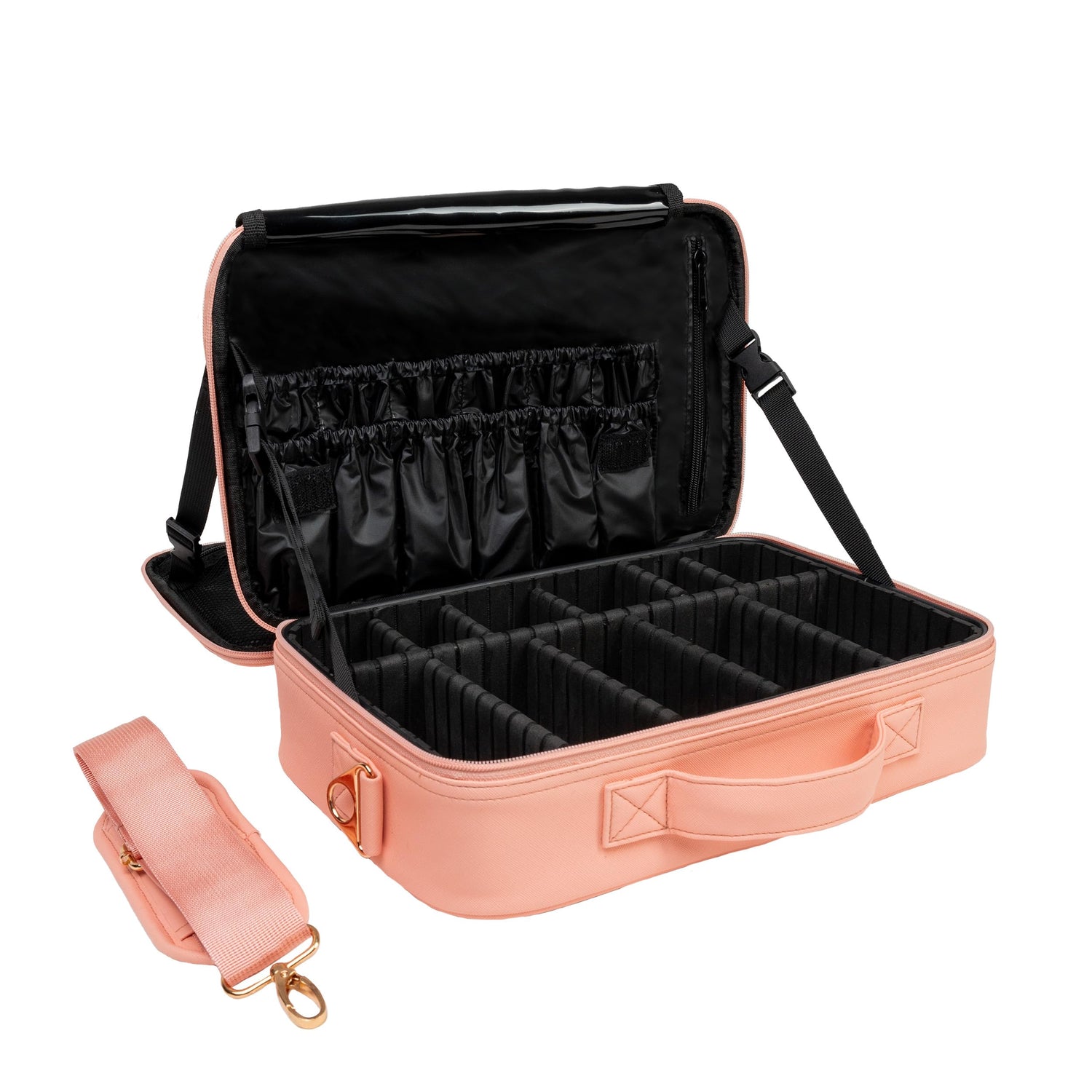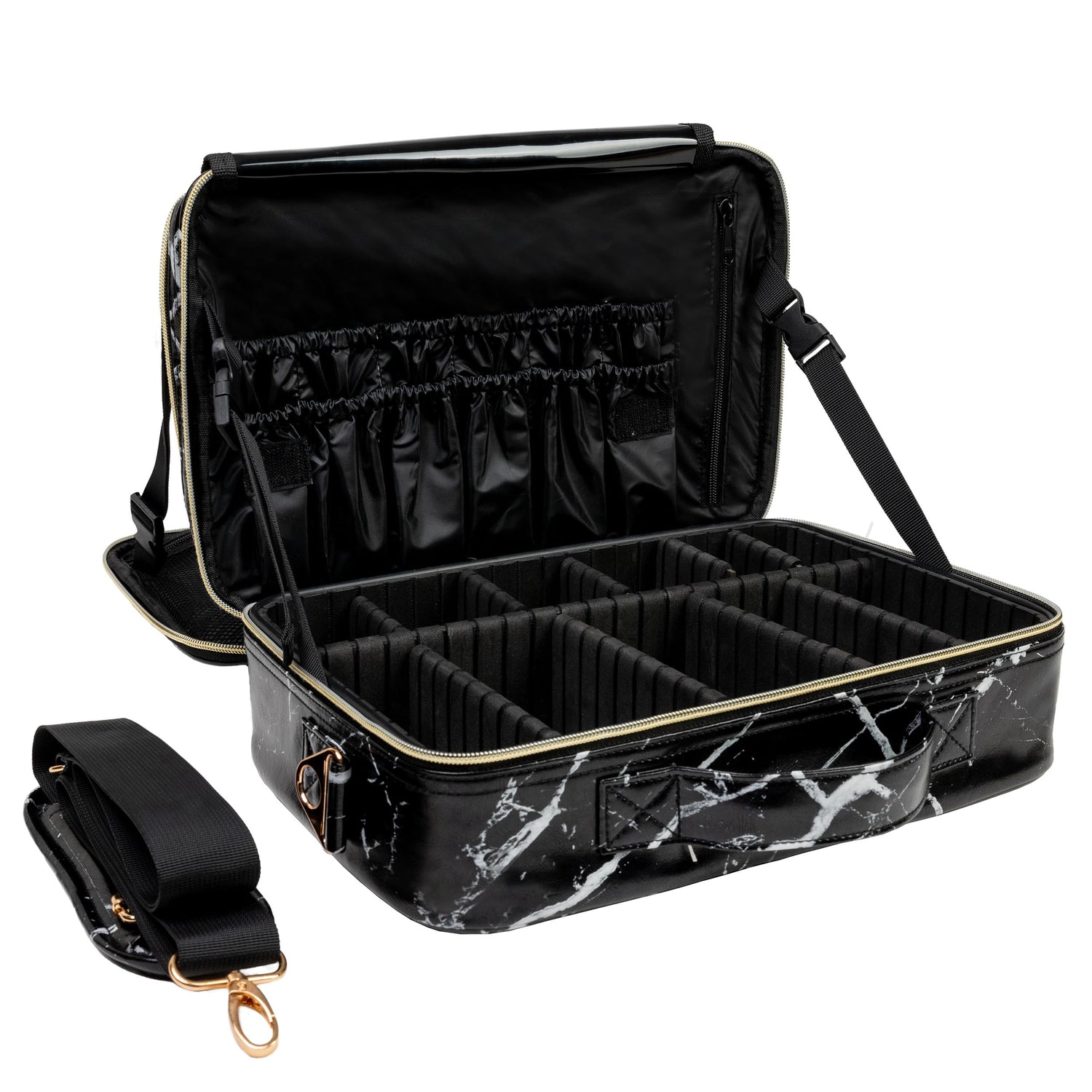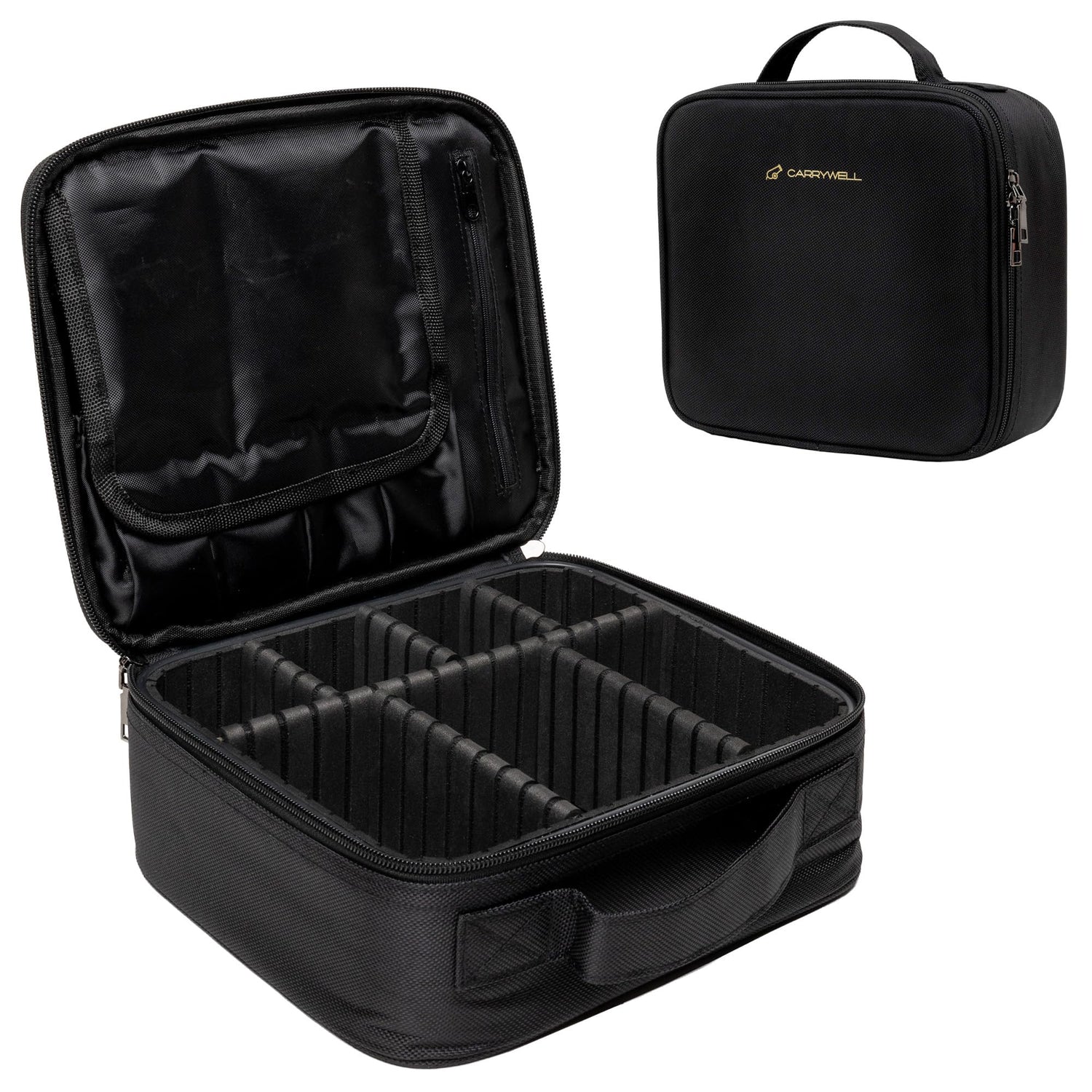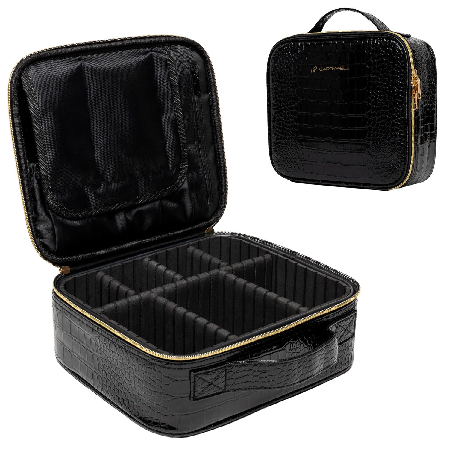 Details: Take your beauty on the road with our sturdy yet stylish makeup train case. Protect your valued products while traveling with the Carrywell train case for women and anyone who loves their makeup! Our adjustable bag lets you alter the compartment sizes as you see fit so you can store your jewelry pieces, electrical essentials, makeup brushes, nail polish and more. Transport anything you need – whether heading on a vacation or a work trip – with a convenient carry case at your fingertips. A makeup organizer bag professional is what you need. Not Made In China We are proud to be a 100% American-owned business, with our headquarters in Miami, Florida. Carrywell makeup travel bags are designed in the United States and responsibly sourced in Myanmar, adhering to top quality industry standards, bringing you products you can trust. Carrywell does not produce anything in China. Adjustable Compartments Adapt this bag top to suit your unique set of needs by adjusting the interior dividers. It features a specific section for makeup brushes and nail polish, helping you keep a neat and tidy makeup bag and an even clearer mind. 2 Sizes Available Looking for something small and compact? Opt for the ultra-portable (9x10.3x3.6”) bag. Or, if you hate forgetting an accessory, choose our medium size, which features an adjustable strap (9x13.4x4.8”), and bring it all along for the ride. Select Your Style Our professional makeup bag travel case comes in four different materials to suit your style seamlessly. Go for minimalistic black polyester, sassy pink Saffiano leather, sexy black crocodile leather, or black marble leather. Invest in your cosmetic products with a Carrywell makeup case!