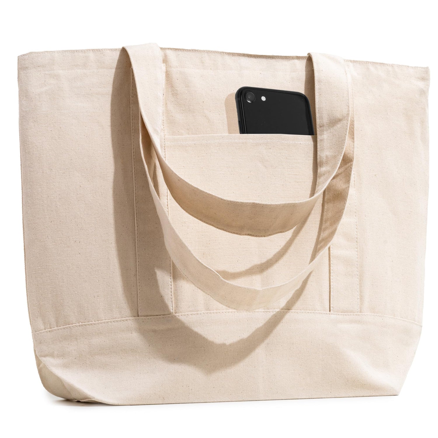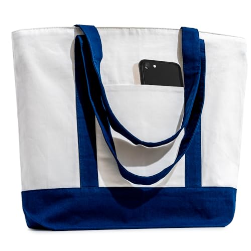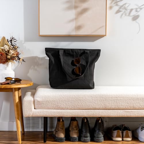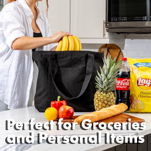 Carrywell Organic Cotton Canvas Totes With Zippered Top, Front Pocket, Heavy Duty Reusable Shopping Bags, Cloth Grocery Bag