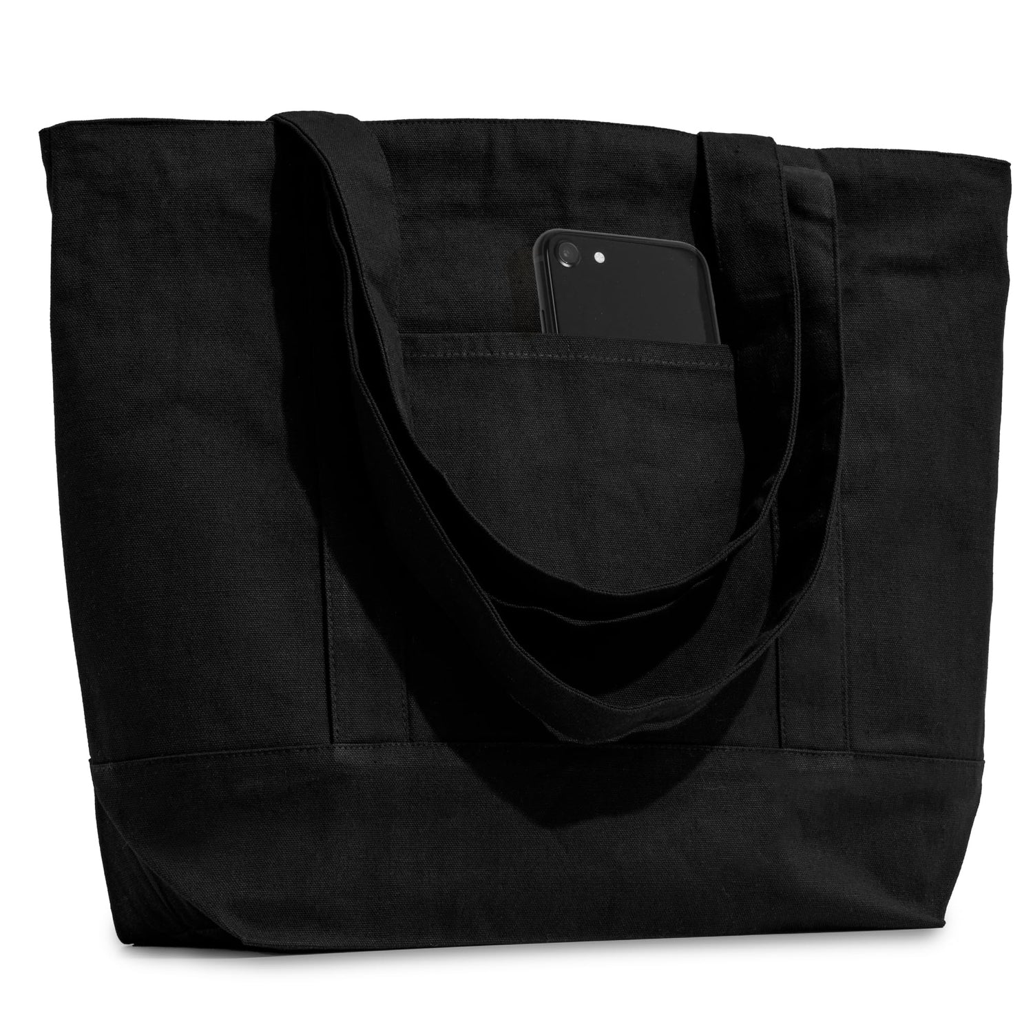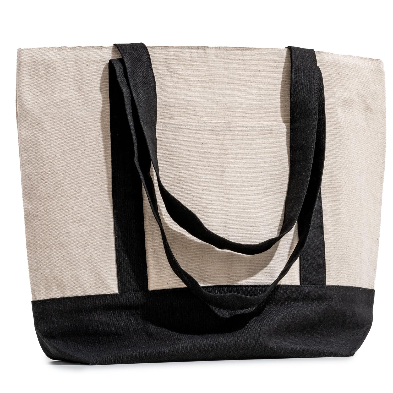 Carrywell Organic Cotton Canvas Totes With Zippered Top, Front Pocket, Heavy Duty Reusable Shopping Bags, Cloth Grocery Bag - Natural W/Black Trim / 30 pack is backordered and will ship as soon as it is back in stock.